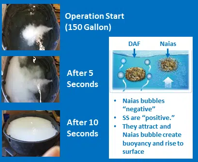 A side-by-side 76 day test was performed between Naias model N-10 with a 5 Hp motor again the DAF system with an 11 Hp motor. Operating with air only (no oxygen or ozone, or any other gas) Naias outperformed the present market DAF system. While this was expected, the test proved with certainty that Naias’s>95% of <5 micron bubbles is far superior to the present DAF system in the market. The unintended outcome was that Naias used 55% less energy. As all wastewater treatment plant utilizes >50% of energy on the aeration system, Naias is able to save more than overall 25% energy usage in wastewater treatment plants.